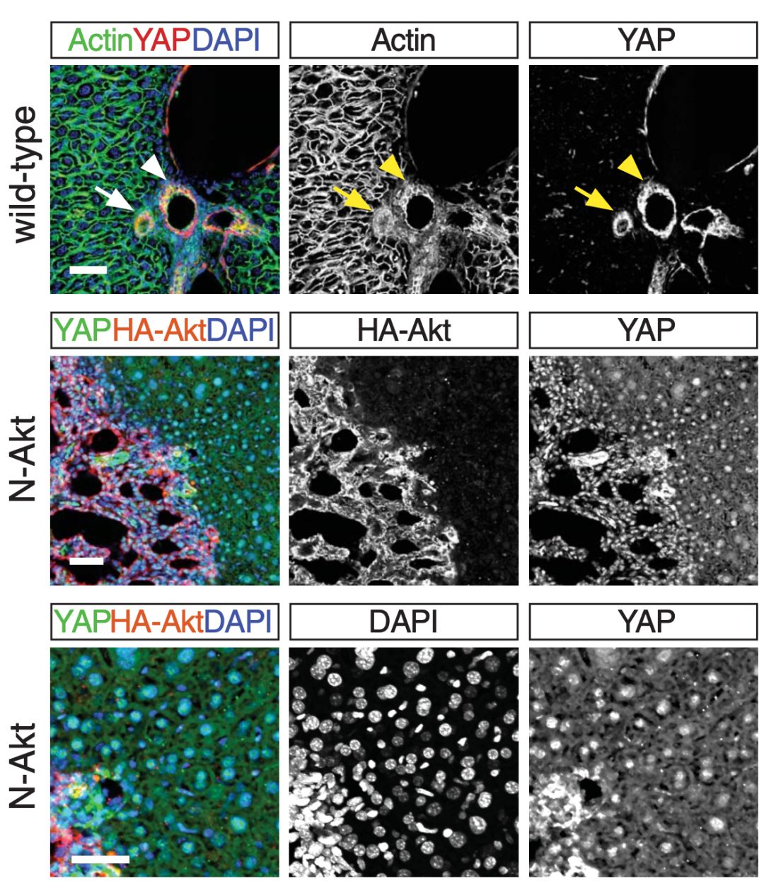 N-Akt肿瘤细胞中存在高水平的YAP和TAZ,这一点和人类的同种肿瘤类似[5]。而且,肿瘤细胞中的YAP水平,与正常表达YAP的胆管和内皮细胞中的YAP水平一样高[6,7]。他们还观察到N-Akt肿瘤周围肝细胞中有YAP积累;相反,在正常肝脏的肝细胞中几乎检测不到YAP。