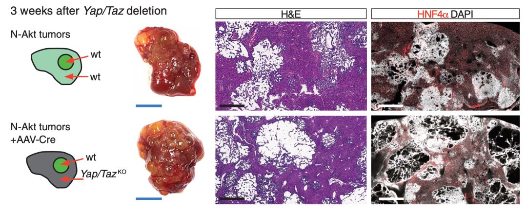 为了确定Hippo通路在肿瘤周围肝细胞中的功能,Halder团队同时定向删除了肿瘤周围健康组织的Yap和Taz,肿瘤细胞中的保留。