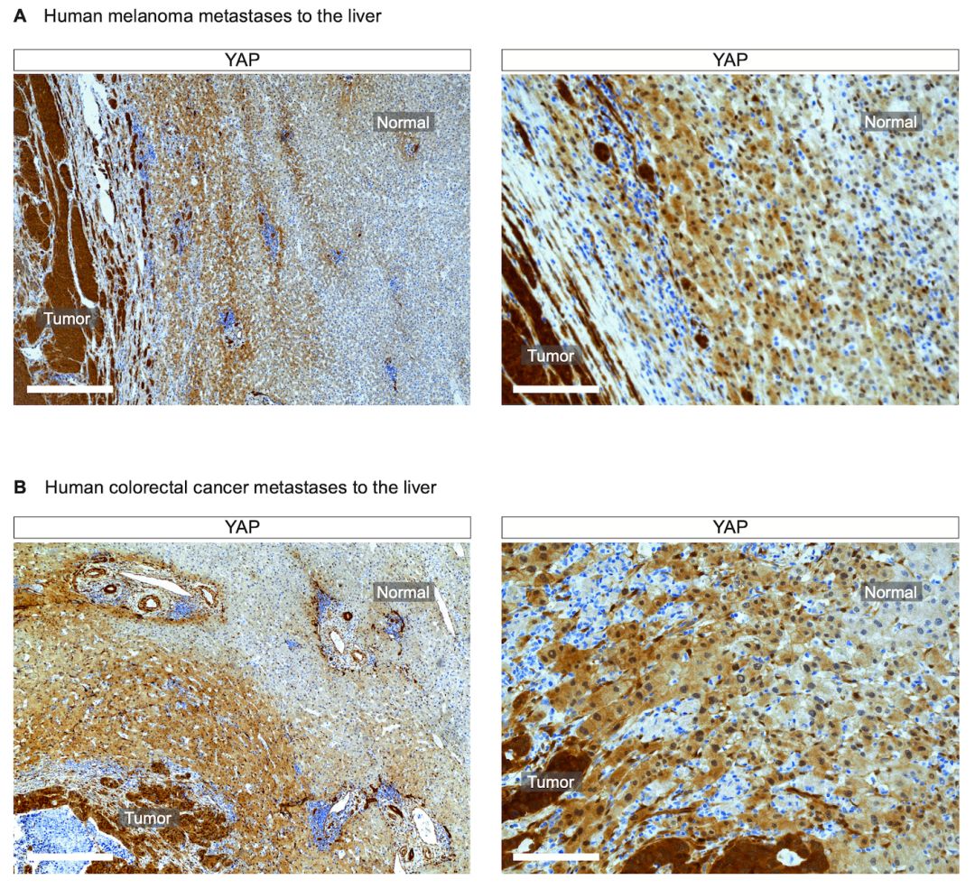 为了了解人体肿瘤的情况,他们还分析了来自患者肿瘤组织的情况。最终发现YAP和TAZ在约50%的人类肝细胞癌和肝内胆管癌的肿瘤周围肝细胞中积累,但在健康的人类肝脏的肝细胞中却没有积累。此外,YAP还会在大肠癌和黑色素瘤转移到肝脏的肿瘤周围区域积累。
