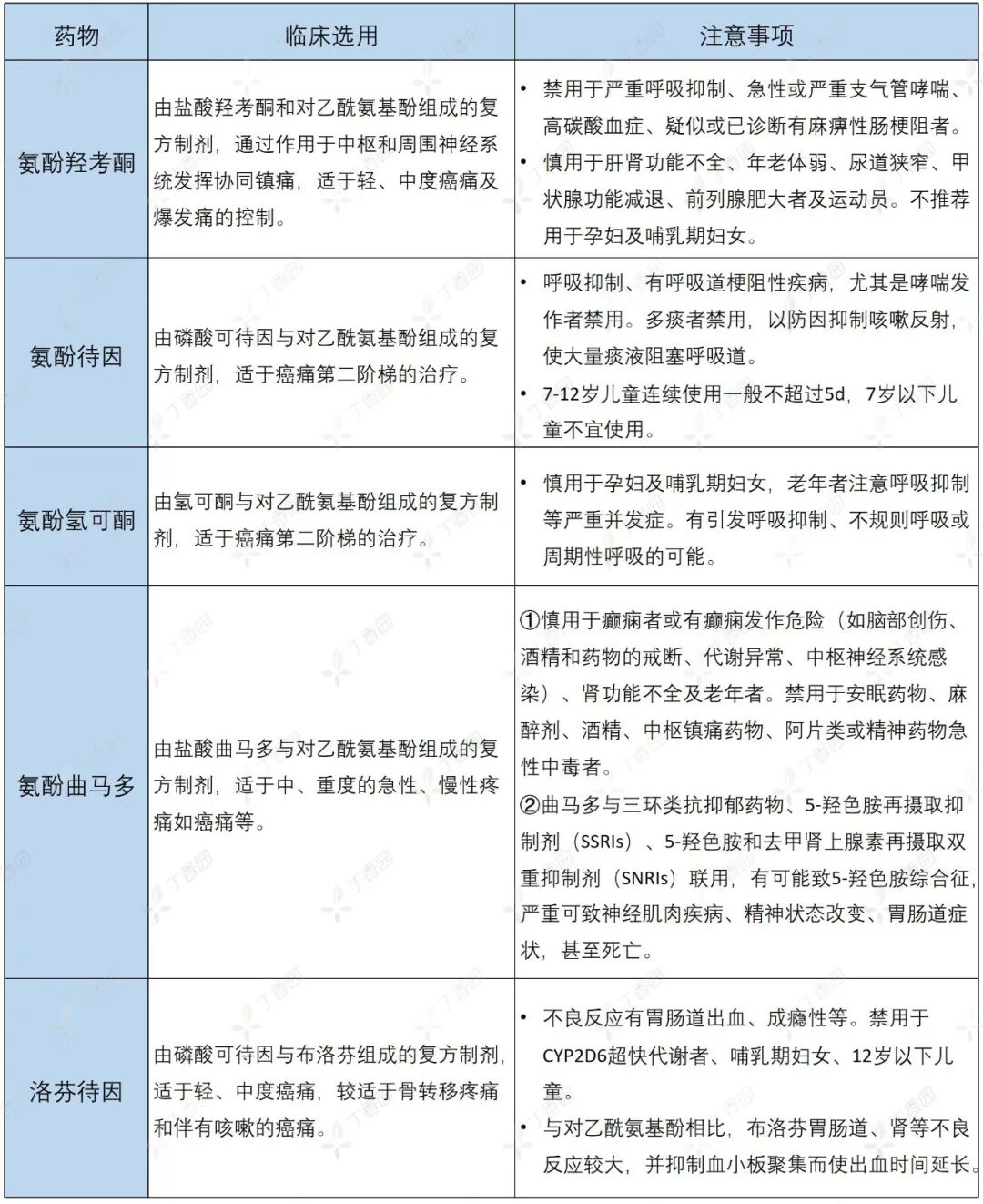 复方阿片类镇痛药物主要是由一种非甾体类抗炎药物(NASIDs,如对乙酰氨基酚、布洛芬)和一种阿片类药物(如羟考酮、可待因、曲马多)组成的复方制剂,如氨酚羟考酮、氨酚待因、氨酚氢可酮、氨酚曲马多、洛芬待因等。
