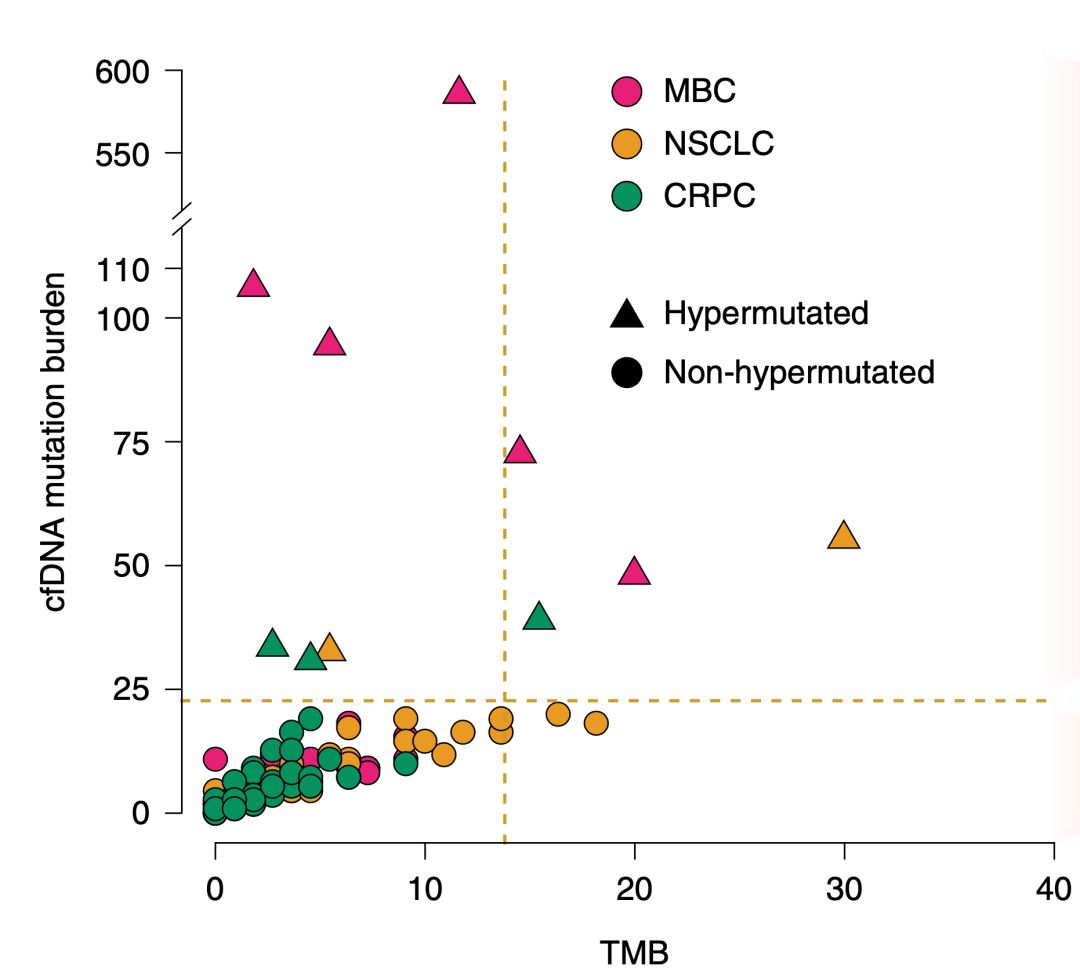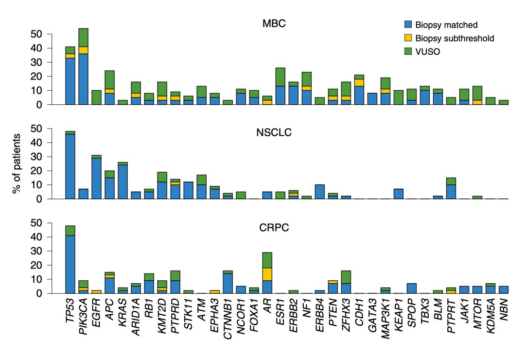 从总体上看,基于肿瘤组织的活检发现了740个突变,基于cfDNA的检测包含其中的530(71.6%)。具体到各个癌种的话,比例也是类似的,乳腺癌72%,非小细胞肺癌和前列腺癌是71%。