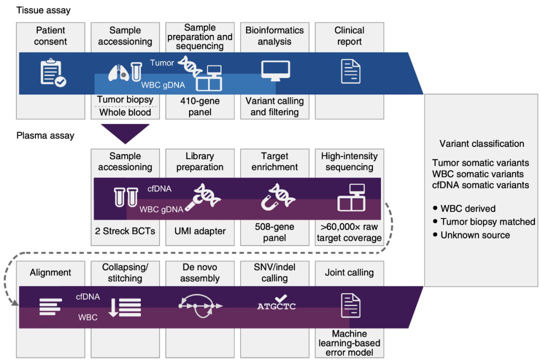研究人员从癌症患者身上获取了肿瘤组织样本、cfDNA和白细胞DNA,从无癌志愿者身上获取了cfDNA和白细胞DNA样本。