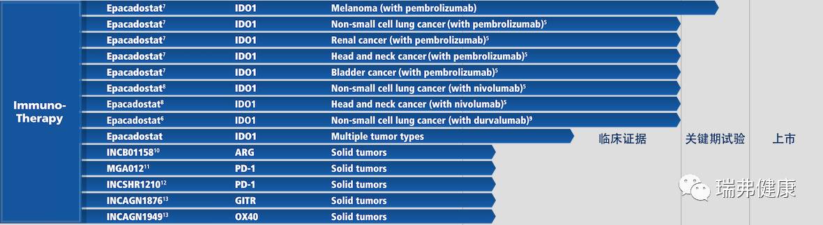 Epacadostat的制药厂商Incyte,已与PD-1单抗的两大巨头默沙东和百时美达成合作协议,将更广泛地挖掘Epacadostat与其他免疫检查点抑制剂的联用功能,适应症囊括了包括非小细胞肺癌、肾癌、头颈部肿瘤、膀胱癌、及其它实体瘤。