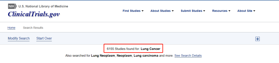 登陆全球最大的临床试验登记平台https://clinicaltrials.gov/,能检索到所有正在开展的大型临床试验项目。以肺癌为例,输入lung cancer,可以搜索到6155个结果!这个数字意味着什么?对肺癌患者而言,就是6155次生存的机会!