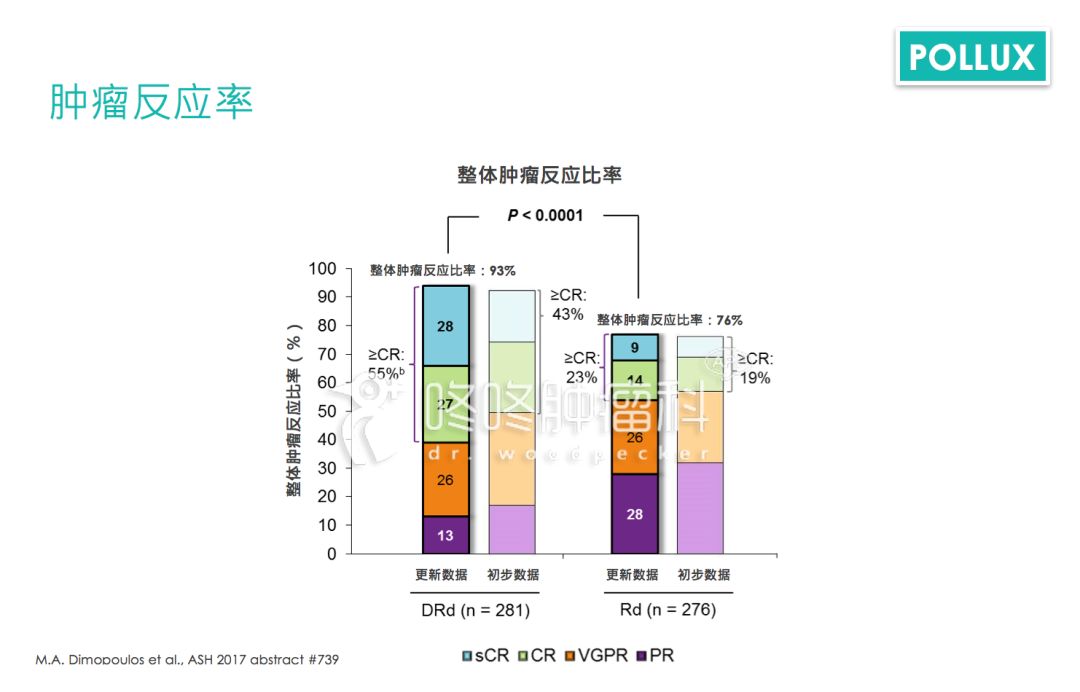 而在肿瘤反应率的分析中,达雷木单抗组别的反应率高达93%,相当理想,传统治疗组别则有76%;至于微量残存疾病阴性比率(MRD-negative rate)达10-5的比例的数据中,达雷木单抗组别为27%,传统组别则只有5%。