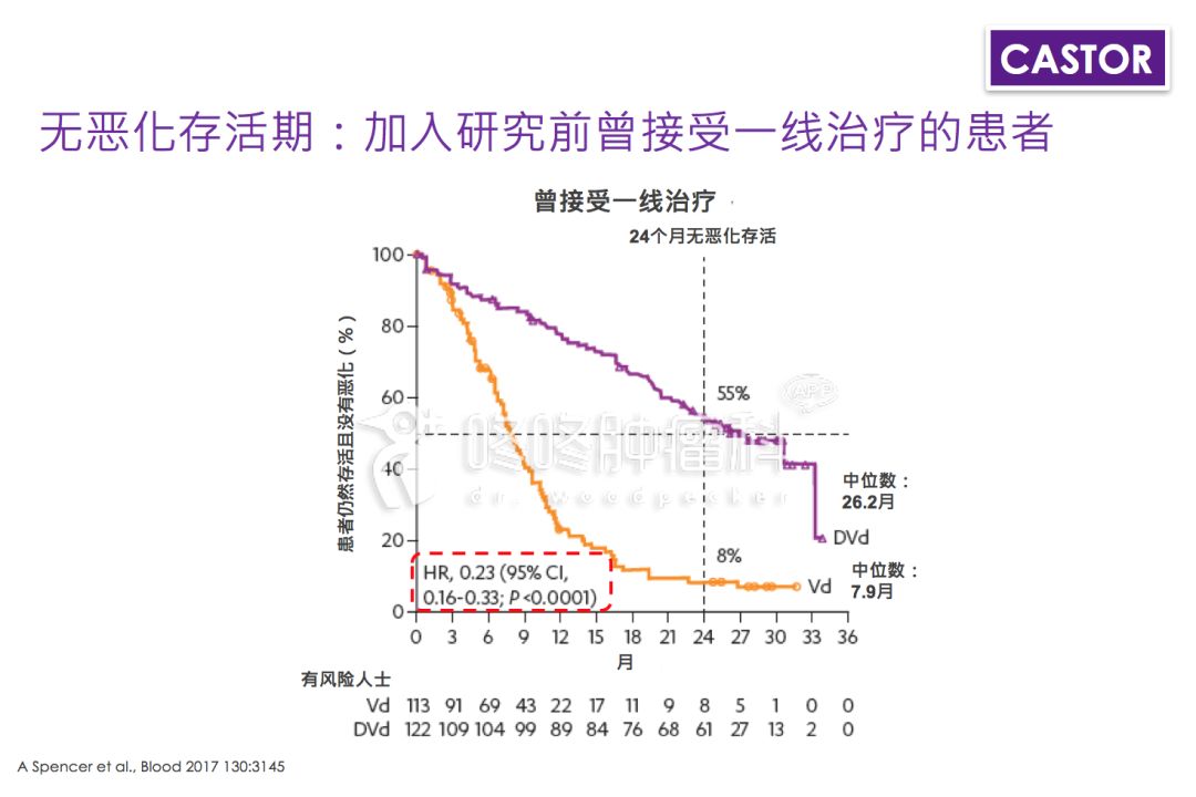 对多发性骨髓瘤患者而言,CASTOR与POLLUX是值得纪念的两个符号,他们奠定了达雷木单抗在治疗中更佳的疗效。CASTOR研究以曾接受过一线或多线治疗的498名多发性骨髓瘤成年患者为研究对象,将患者随机安排接受不同治疗。其中251名被安排接受达雷木单抗、硼替佐米及地塞米松治疗,另外247名则被安排接受硼替佐米及地塞米松单独治疗。硼替佐米及地塞米松为传统药物组合。此研究的首个终点为无恶化存活期,次要终点则为恶化出现时间、整体存活期、肿瘤反应率、肿瘤反应时间等。