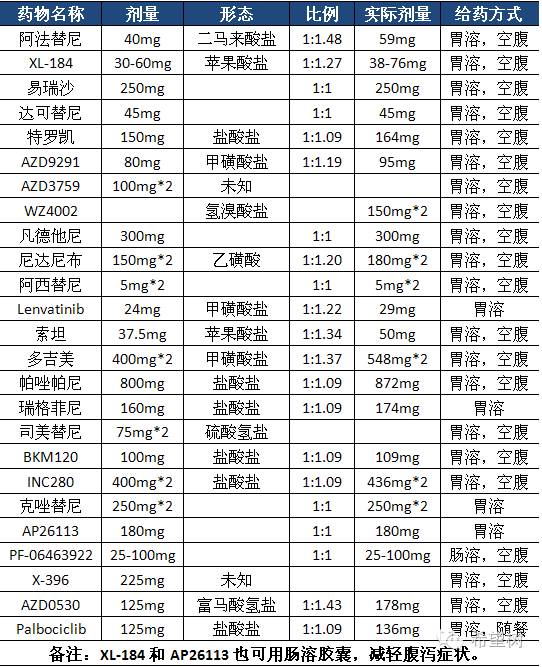药物说明书中剂量指的是活性化合物含量,比如说阿法替尼的上市剂型是阿法替尼二马来酸盐片剂,标准剂量是40mg每天一次,这40mg是1片阿法替尼中的游离碱等效含量,并不是阿法替尼二马来酸盐的含量。阿法替尼游离碱的分子量是485.9,阿法替尼二马来酸盐的分子量是718.1,换算比例就是1:1.48,也就是说59.1mg的阿法替尼二马来酸盐等效于40mg阿法替尼游离碱。如果一个药物的上市或临床剂型是没有成盐的,比如特罗凯和达可替尼等,那么就无需换算,比例就是1:1。