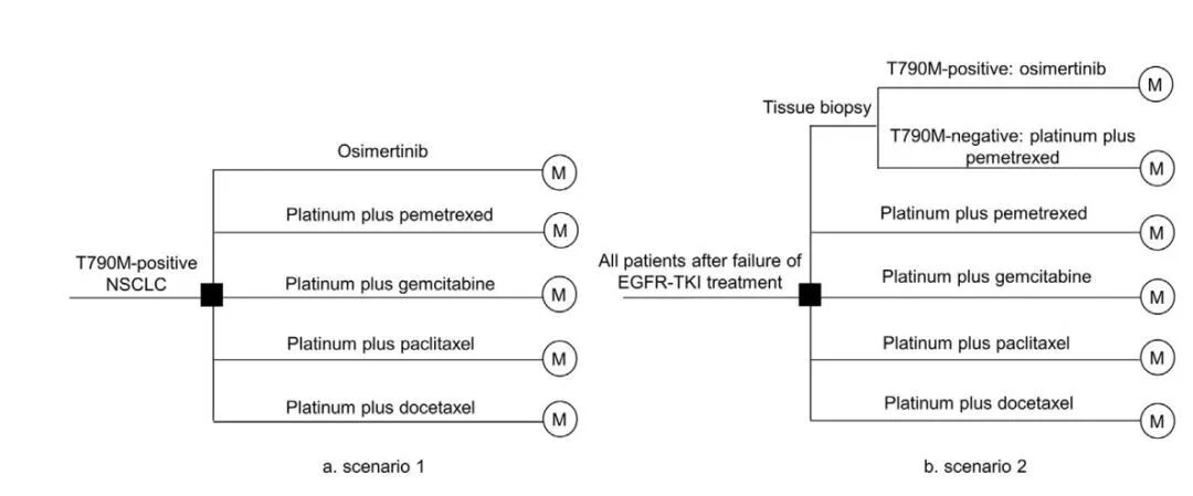 研究者基于Markov模型,构建了两个方案。方案1全部为T790M阳性的患者,治疗组接受奥希替尼治疗、对照组接受4种化疗方案中的任意一种(图a)。方案2为一线EGFR TKI治疗后进展的晚期NSCLC患者,治疗组患者先接受基因检测,T790M阳性患者接受奥希替尼治疗,T790M阴性患者接受PP(培美曲塞+铂类)化疗;对照组的患者不进行基因检测,直接接受化疗(图b)。