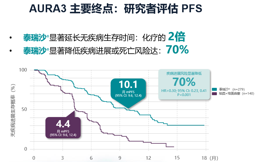 这一政策主要基于Ⅲ期试验AURA3[2],奥希替尼组相比培美曲塞+顺铂/卡铂(PP)mPFS显著延长(10.1个月 vs 4.4个月; HR=0.30; 95% CI 0.23-0.41; P<0.001),尤其是基线合并脑转移的患者,奥希替尼使mPFS延长至8.5个月(化疗组仅有4.2个月)。
