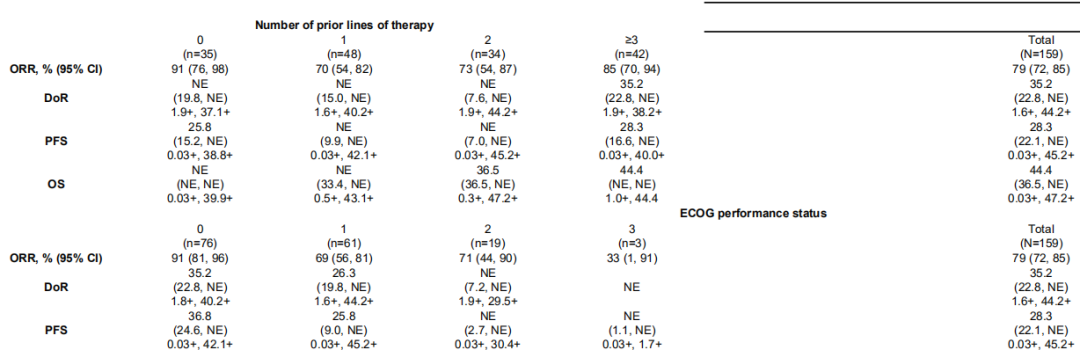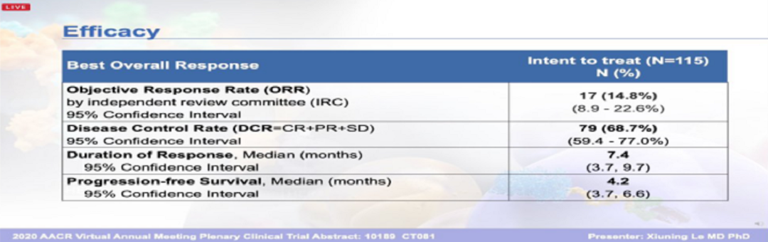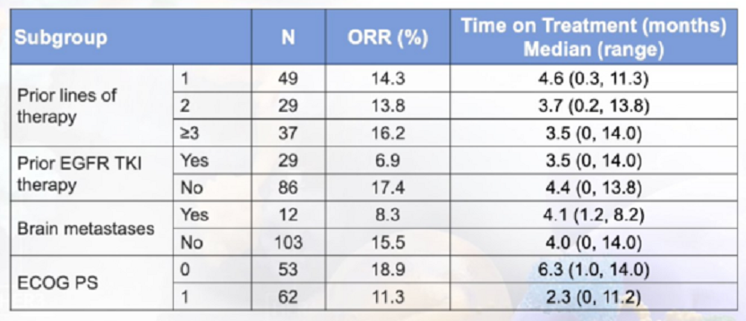 亚组分析显示,在既往接受过1、2、3或更多线治疗患者的亚组中,ORR相当一致,分别为14.3%、13.8%和16.2%。在先前没有用过EGFR-TKI治疗的患者中观察到最高的ORR(17.4%),没有脑转移的患者ORR为15.5%,体能评分(ECOG)为0患者ORR为18.9%。
