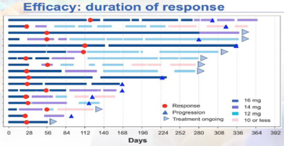 在总人群中,中位缓解持续时间(DOR)为7.4个月(95%CI 3.7-9.7),中位无进展生存期(PFS)为4.2个月,相比之下,既往其他一代/二代EGFR-TKI治疗20ins的中位PFS只有2个月左右,已经相当不错。