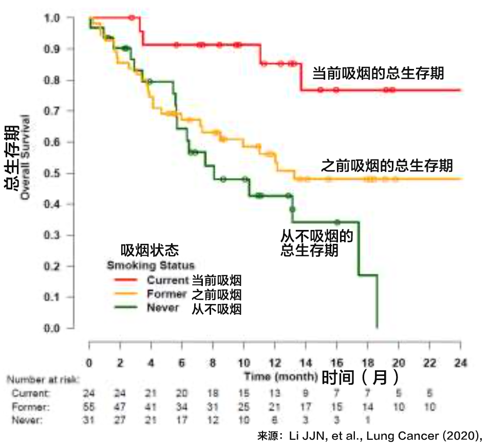 一项最新的文献报道再次分析了吸烟者使用PD-1治疗的优势。这是一项入组了268名晚期非小细胞肺癌患者的前瞻性临床研究。主要分析这些患者吸烟的状态,包含现在吸烟、之前吸烟现在戒掉和从未吸烟三种情况。