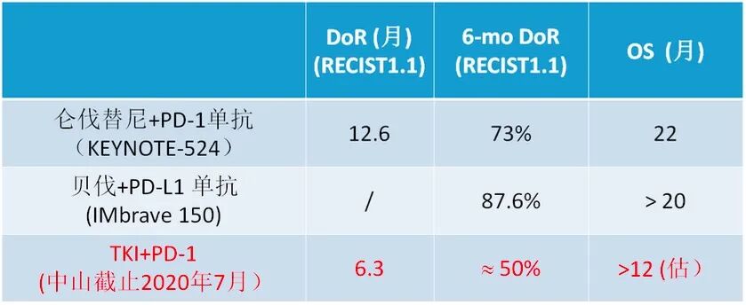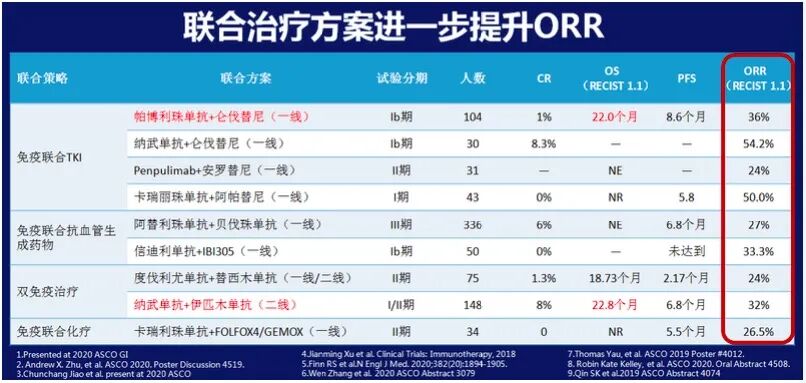 近两年,不同靶向和免疫治疗药物的相互联合治疗方案,包括仑伐替尼联合PD-1免疫检查点抑制剂帕博利珠单抗的“可乐”方案(KEYNOTE-524研究),以及PD-L1免疫检查点抑制剂阿替利珠单抗联合联合抗血管生成药物贝伐珠单抗的“T+A”方案(IMbrave150研究),显示可以进一步提升ORR至30%~50%。