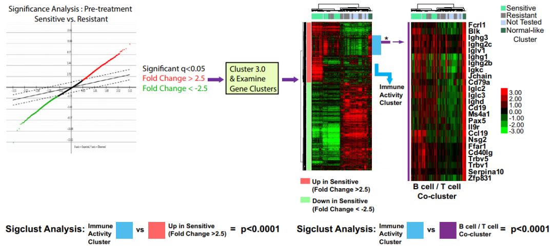测序显示的一大特征,是CD8+T细胞相关的抗肿瘤免疫激活,这并不稀奇。但另一大特征就有意思了:B细胞/T细胞/IgG共调控基因(B Cell/T Cell co-cluster)的显著上调。这种特征,还出现在了几项临床试验的患者测序结果中。