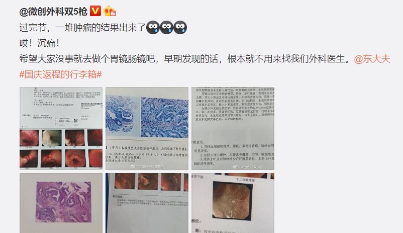 刚回到工作岗位的空军第986医院普外科医生双剑博看着眼前的一堆肿瘤检查结果,打开自己的微博,发出了沉痛呼吁:希望大家没事就去做个胃镜、肠镜吧,早期发现,就不用来找我们外科医生了。