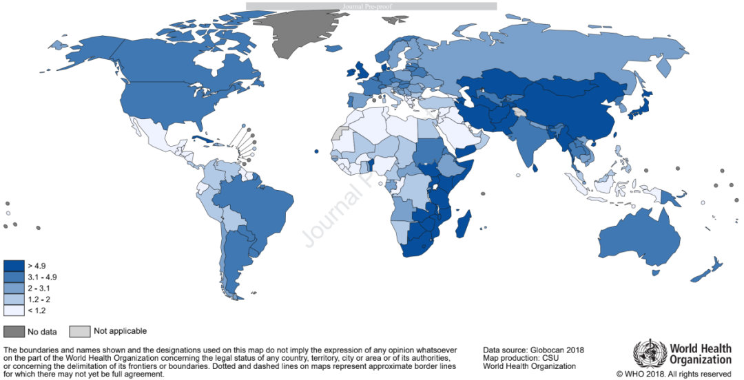 图1:2020年Gastroenterology发布2018年“全球胃癌大数据”,各个国家每10万人的年龄标准化胃癌发病率,颜色越深,说明发病数越多