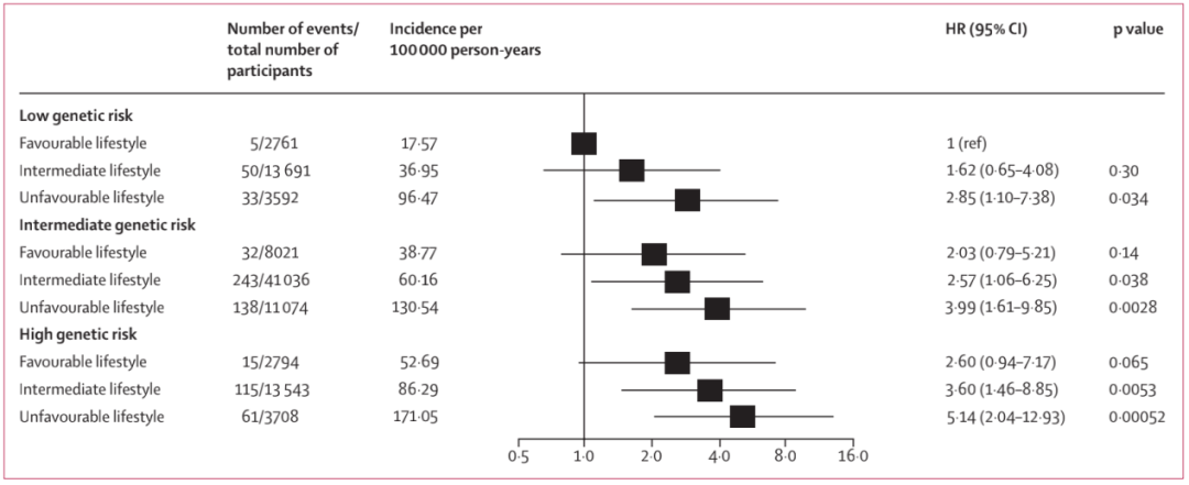 结果发现,无论遗传风险如何,随着不健康生活方式的增加,个体罹患胃癌的风险也会直线上升。相较于坚持健康生活方式的人群,中等及不健康生活方式人群发生胃癌的风险分别增加了34%(HR=1.34;95%CI 1.00-1.81;p=0.052)和103%(HR=2.03;95%CI 1.46-2.83;p<0.0001)。