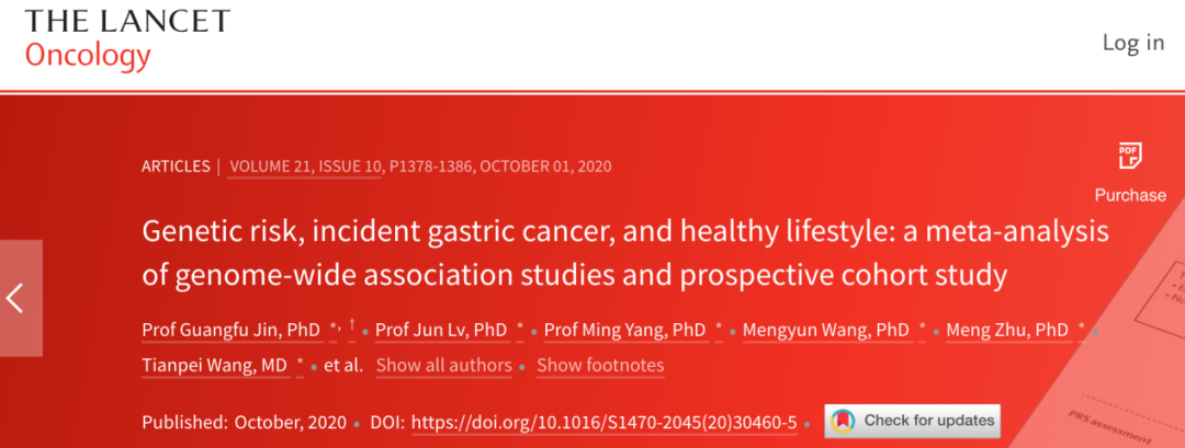 [3]Jin, Guangfu et al. Genetic risk, incident gastric cancer, and healthy lifestyle: a meta-analysis of genome-wide association studies and prospective cohort study. The Lancet Oncology, Volume 21, Issue 10, 1378-1386.
