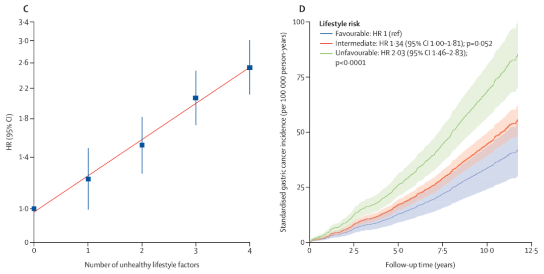 图5:胃癌发病风险随着不健康生活方式的增加而升高